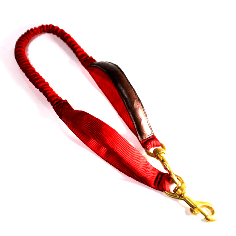 Fabricado en reata de nylon elástica de alta resistencia y dos mosquetones de bronce , doble agarradera acolchada con acabados en cuero.